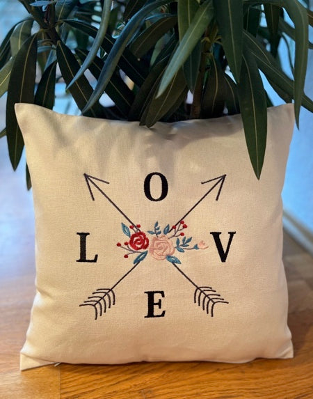 Kissen Love, Pfeile, Blumen 40x40cm, besticktes Kissen in Bio-Baumwollqualität