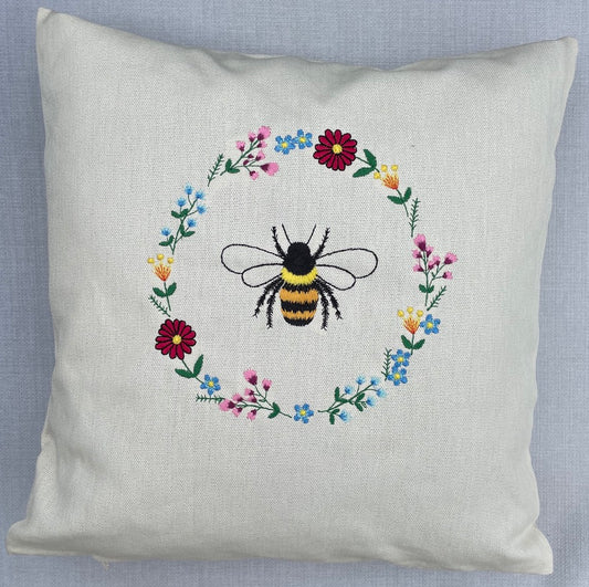 Kissenbezug - bestickt - Biene/Hummel mit Blumenkranz