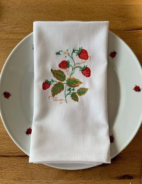 Stoffservietten, 40x40cm, Damast, Baumwolle, weiß, Erdbeere, bestickt, festlich, Tischdekoration, Set, Tischwäsche, Heimtextilien