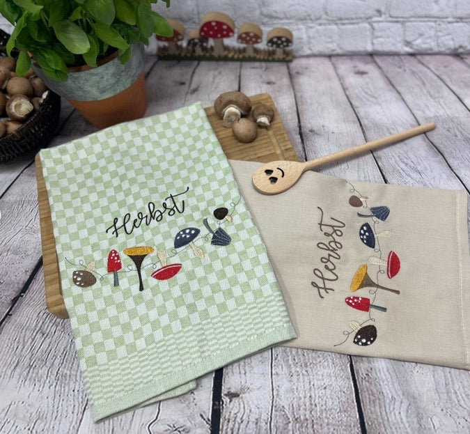 Das bestickte Geschirrtuch ist das perfekte Geschenk für all diejenigen die den Herbst und Pilze lieben.