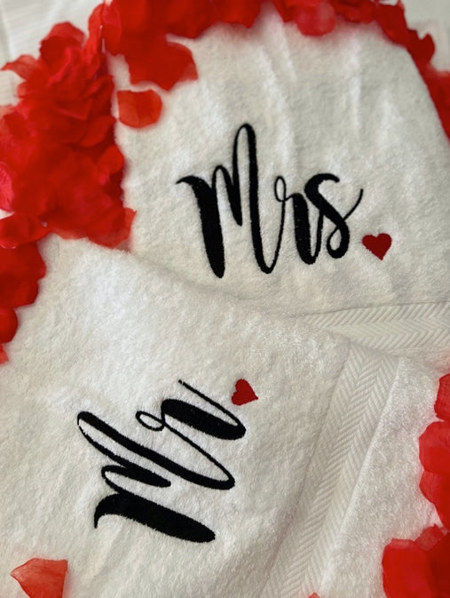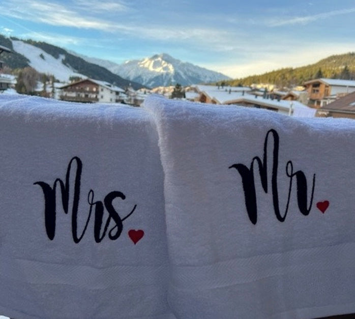 Die Handtücher werden mittig am unteren Ende mit der Motiv Mr. & Mrs. bestickt.