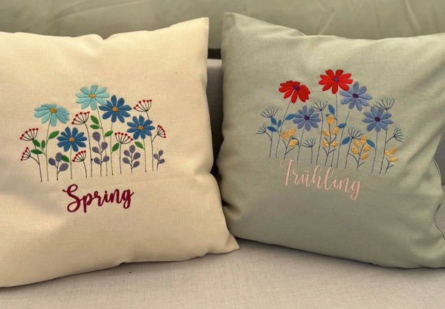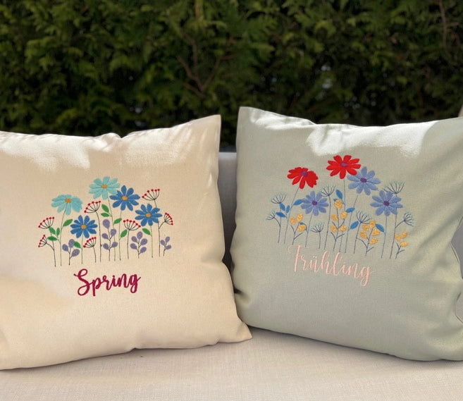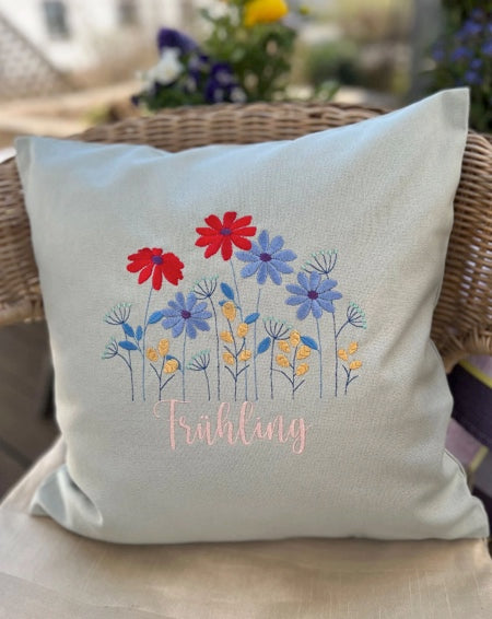Kissenbezug bestickt, Frühling, Spring, Blumenwiese, Blumen, Biobaumwolle 40x40cm