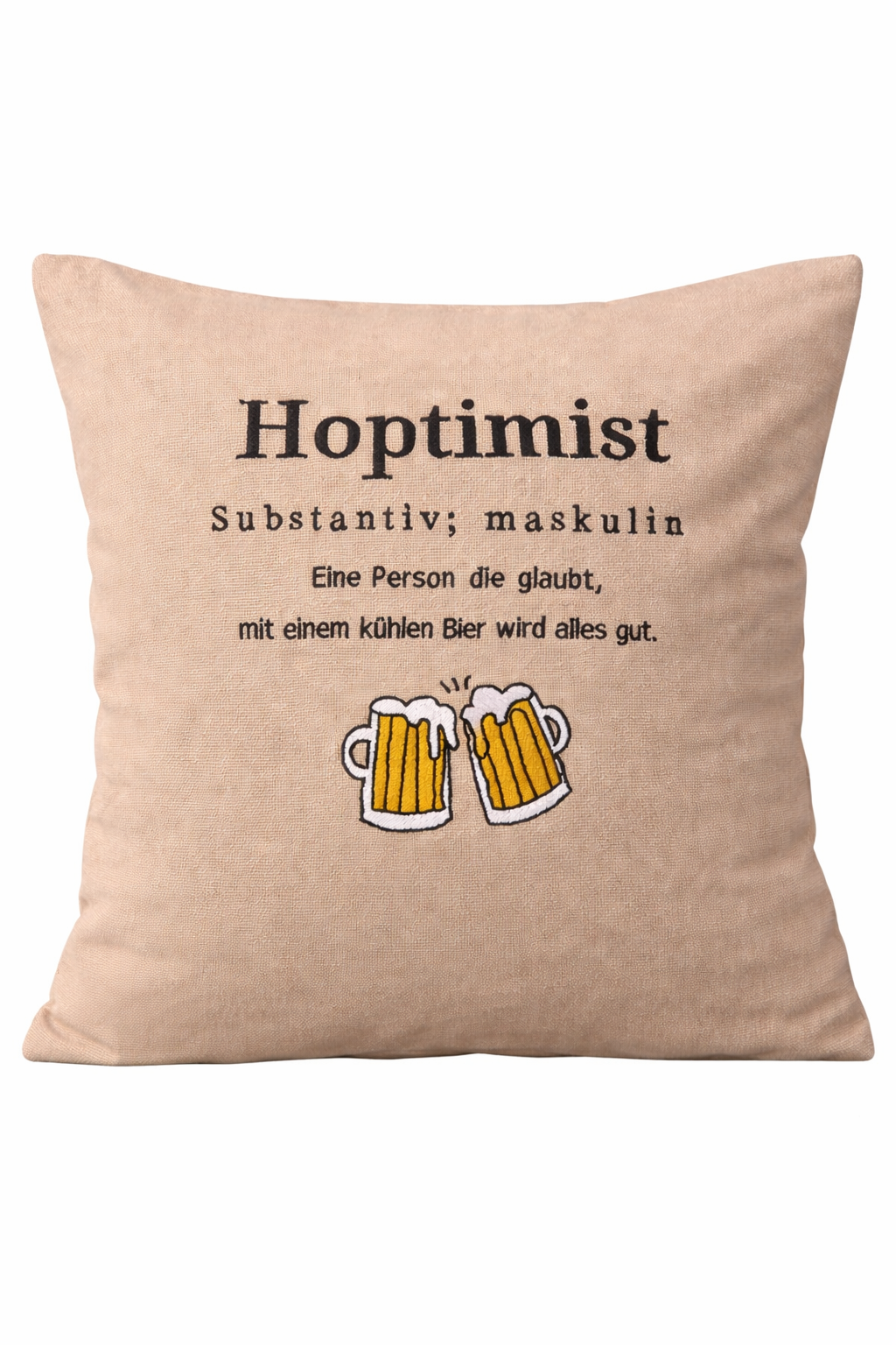 Dieser bestickte Kissenbezug ist eine liebevolle Geschenkidee und ein hochwertiges Mitbringsel für Bierliebhaber und wahre Hoptimisten